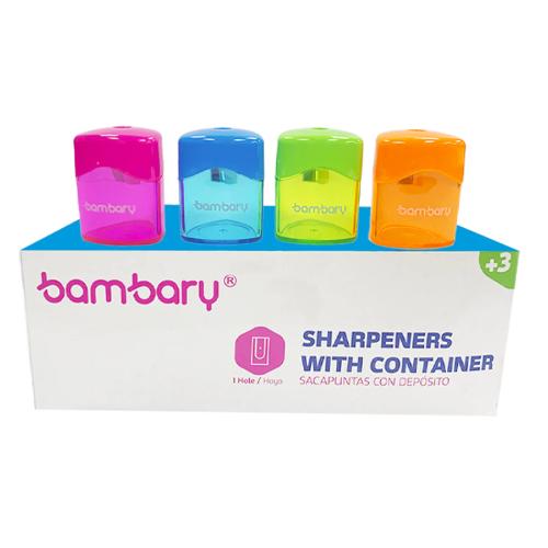 ART SUPPLIES BAMBARY PLASTIC SHARPENER 1 HOLE W/DEPOSIT 4 COLORS BOX 12UNT
