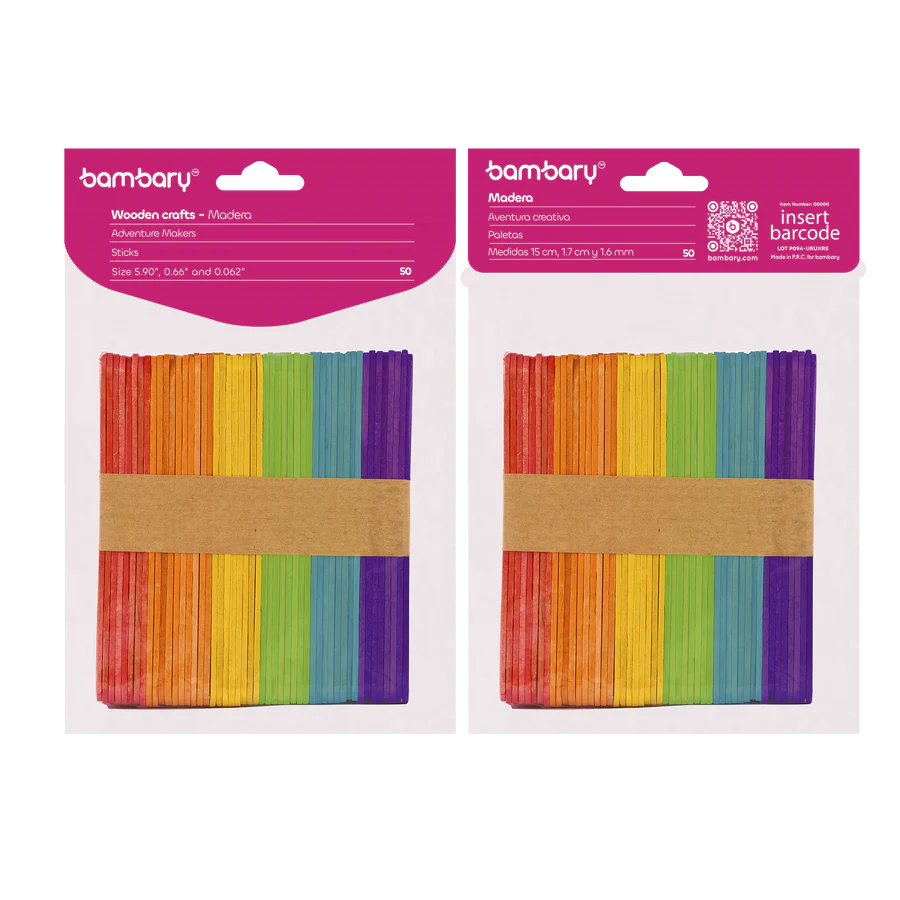 ART SUPPLIES BAMBARY WOOD CRAFT STICKS 114 x 10 x 2 mm A/S BAG x 100 UNT MULTICOLOR..